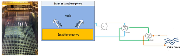 Pri skladiščenju izrabljenega goriva v bazenu se za odvod zaostale toplote, ki se sprošča ob radioaktivnem razpadu cepitvenih produktov uporablja kroženje vode. Za hlajenje vode v bazenu so potrebni toplotni prenosniki in črpalke, torej sta za delovanje teh sistemov potrebni voda in električna energija. Toplota se odvaja preko sistema za hlajenje komponent v ponor toplote – reko Savo.