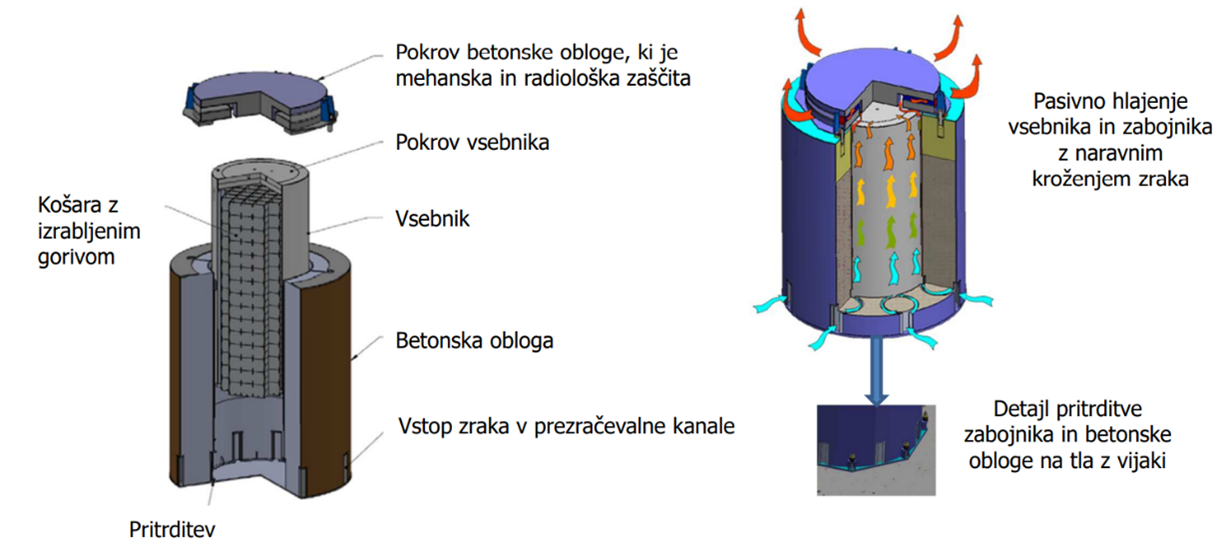 Izrabljeni gorivni elementi se uskladiščijo v vsebniku, kjer je helijeva atmosfera. Vsebnik je mehanska zaščita in omogoča prenos zaostale toplote v zrak, ki kroži okoli vsebnika in ga hladi. Vsebnik je v skladišču vstavljen v zabojnik, ki vsebuje debel betonski plašč, kar predstavlja mehansko in radiološko zaščito. Iz bazena z izrabljenim gorivom do suhega skladišča se gorivni elementi prenesejo v transfernem zabojniku.